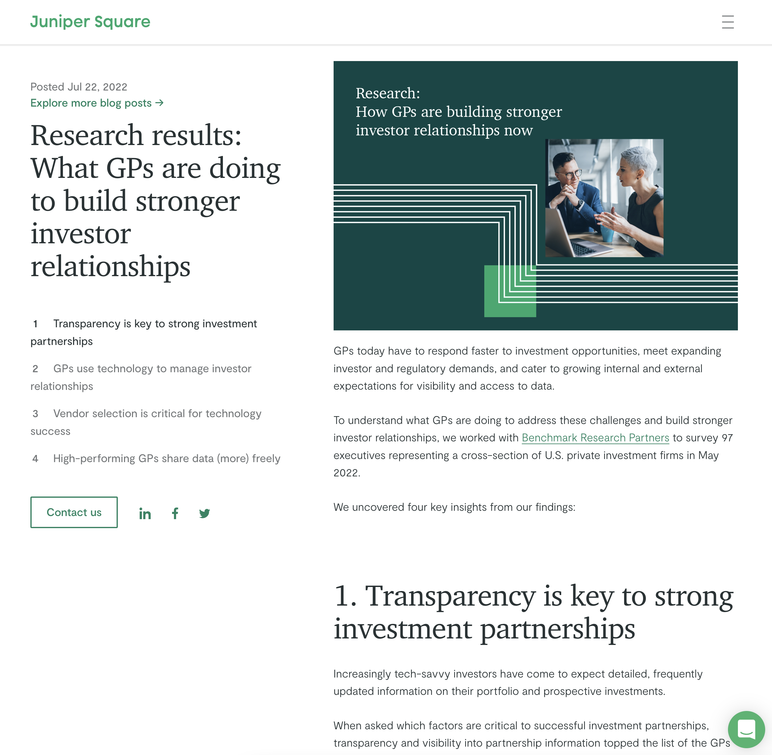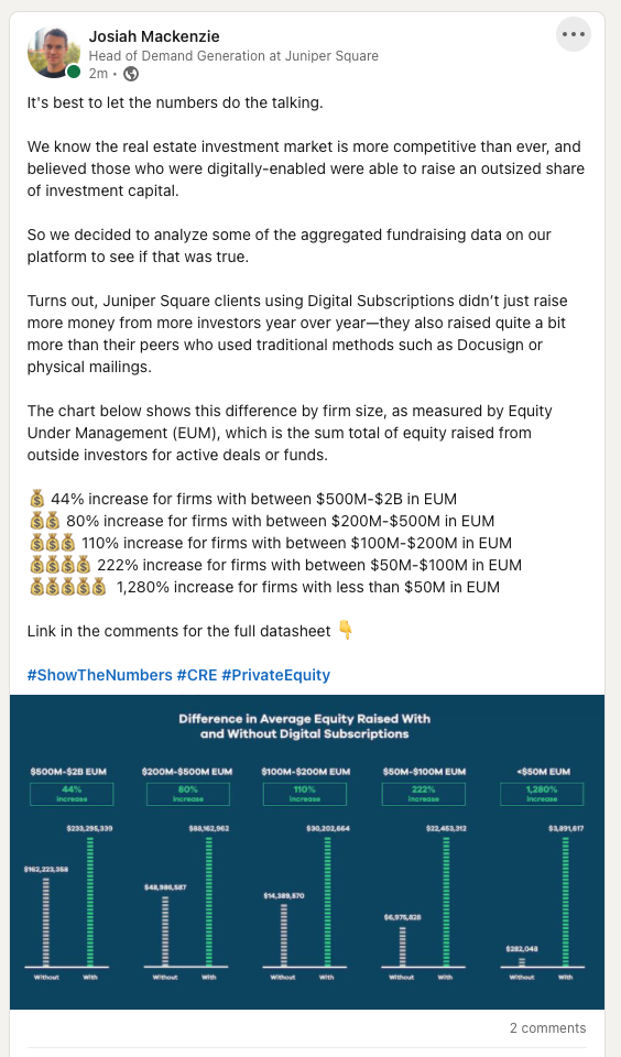 You can share findings that show overall industry trends, but don’t shy away from also showing evidence that your solution is driving performance for your clients. Here’s an example of how I did this at Juniper Square: